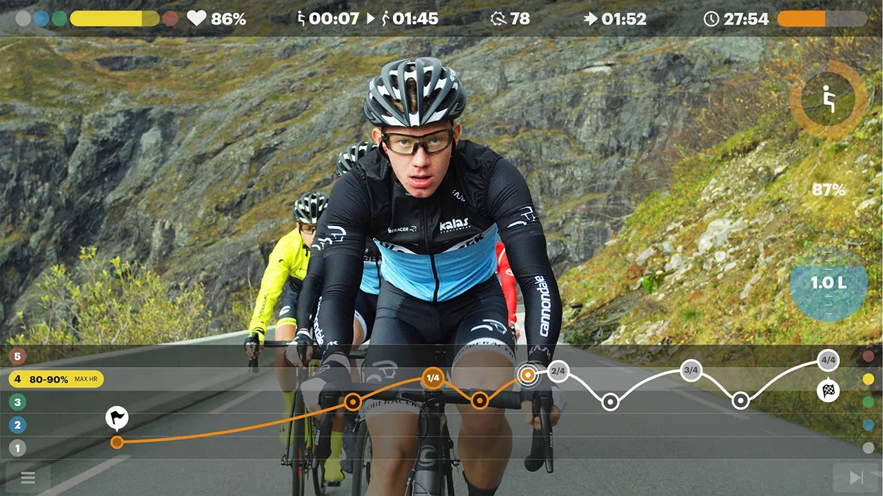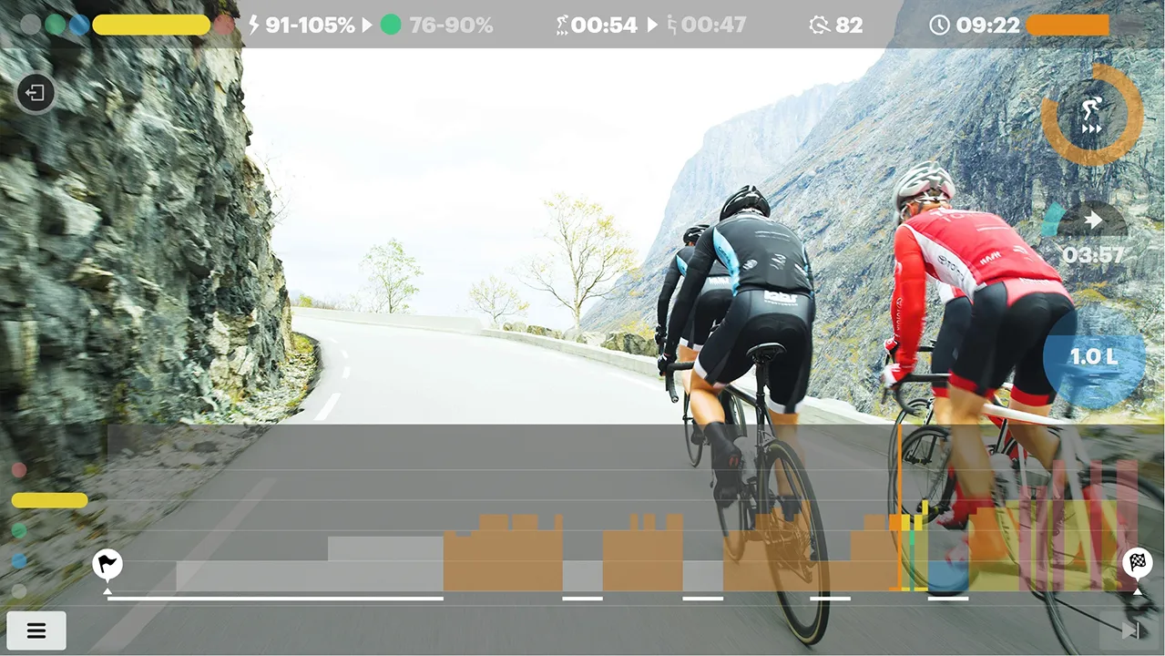 No guesswork where we are going. The power-based intensity graph maps out current and upcoming intervals. The color represents the different intensity zones.